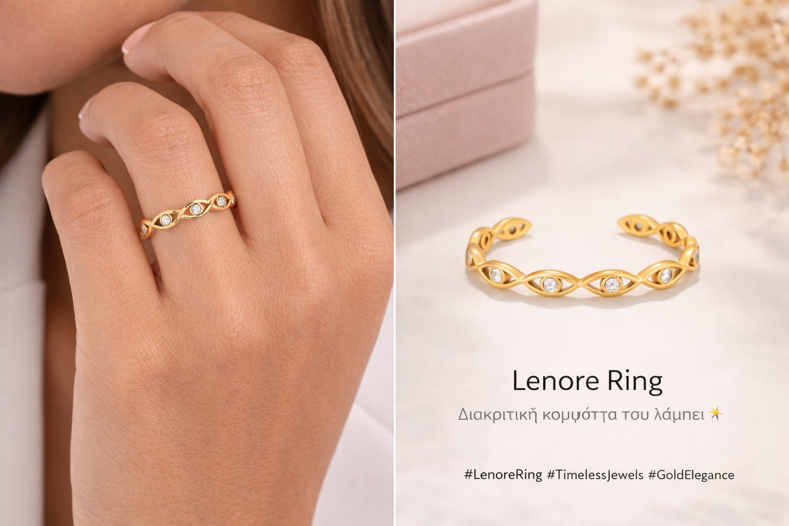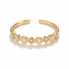 Κομψό και φίνο cuff δαχτυλίδι από ανοξείδωτο ατσάλι, επιχρυσωμένο με 18Κ, διακοσμημένο με λαμπερό συνθετικό ζιργκόν στο κέντρο κάθε μοτίβου. Ο ανοιχτός σχεδιασμός του προσφέρει άνετη και ρυθμιζόμενη εφαρμογή, καθιστώντας το ιδανικό για καθημερινή χρήση.